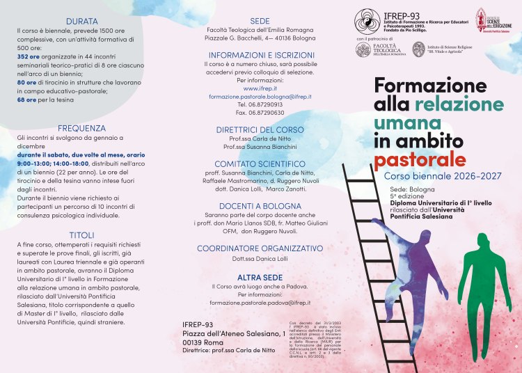 L’IFREP-93 promuove il Corso biennale di Formazione alla relazione umana in ambito pastorale. Il Corso rilascia il Diploma Universitario di I° livello, equivalente al titolo di Master di I° livello, mediante l’Università Pontificia Salesiana.